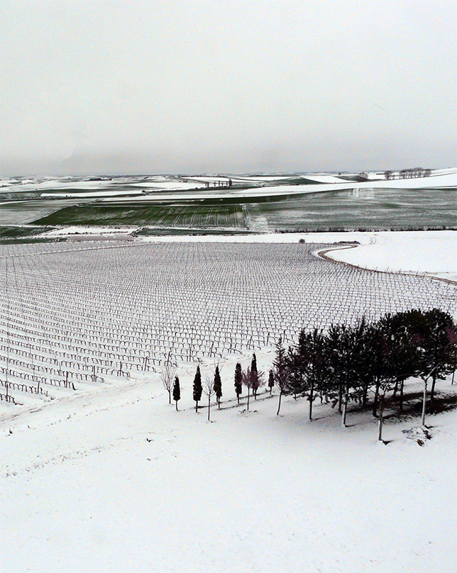 En invierno la vid se encuentra en reposo, es el momento de la poda. La poda es realizada manualmente, planta por planta. Se conservan dos yemas por cepa, siendo eliminados el resto de los sarmientos. Según nos vamos acercando a la primavera la vid empieza a crecer y los brotes son guiados y fijados manualmente a los alambres de las espalderas.