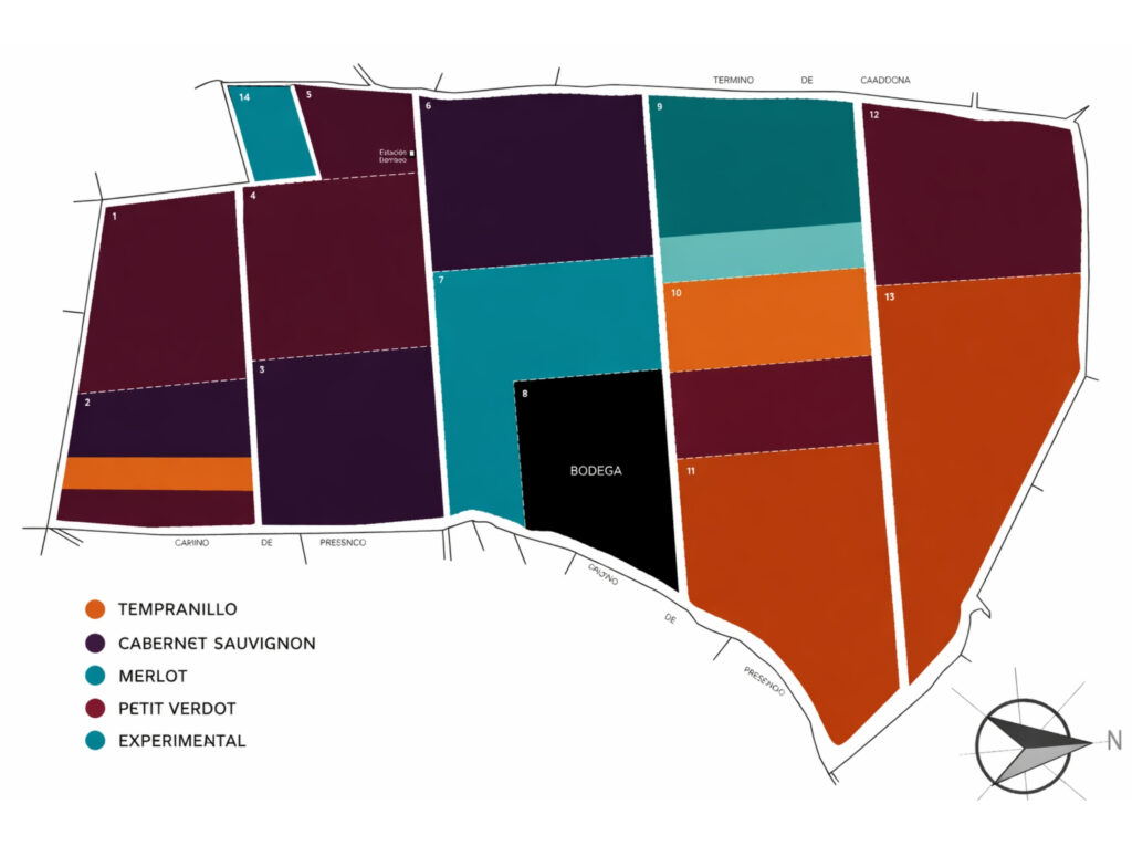 En el mapa a continuación se puede apreciar la Finca y las superficies dedicadas a la plantación de las variedades indicadas.